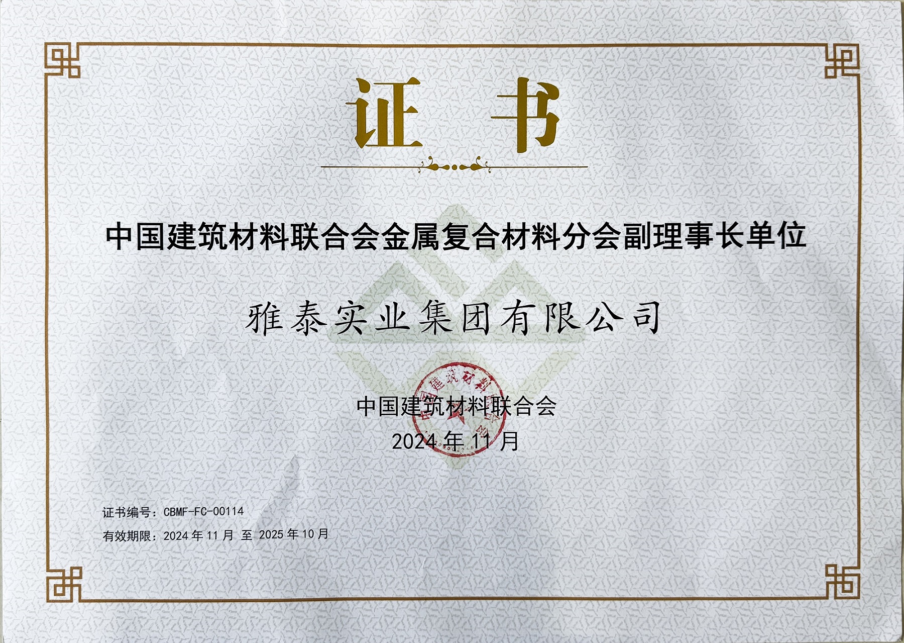 同時,雅泰實業(yè)集團(tuán)作為幕墻行業(yè)優(yōu)秀的國內(nèi)老字號品牌,也長年擔(dān)任著中國建筑材料聯(lián)合會理事、金屬復(fù)合材料分會副理事長等角色。