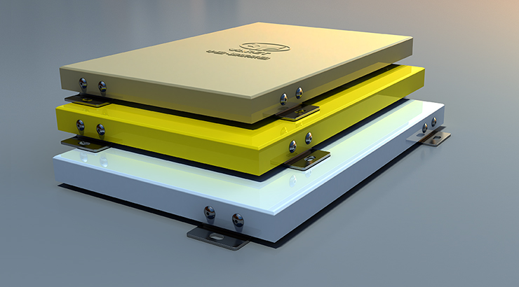 烤瓷鋁單板采用鋁合金板為基材,表面涂裝水性陶瓷涂料,通過加熱固化方式,形成性能與陶瓷相似的涂層,具有耐高溫、不燃性、超強耐候、易清潔、高硬度、抗劃傷、抗菌等優(yōu)勢,且不含傳統(tǒng)有機溶劑,屬于綠色環(huán)保材料。